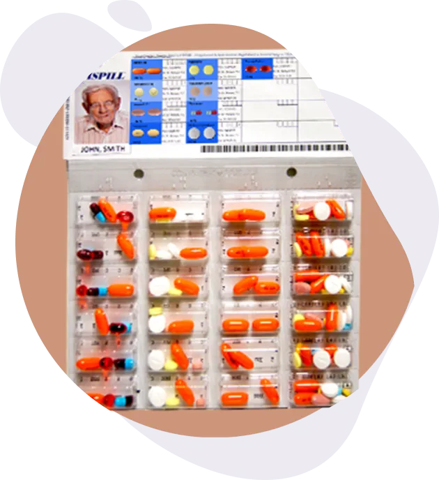 Blister packaging pre-packages a patient’s medications for a full week by time of day (morning, lunch, supper, bedtime) in order to provide the safe delivery of prescribed drugs to our clients. It eliminates risks associated with handling drugs, ensures the right medications are taken at the correct time of day, and saves preparation time as patients no longer have to sort their medications.