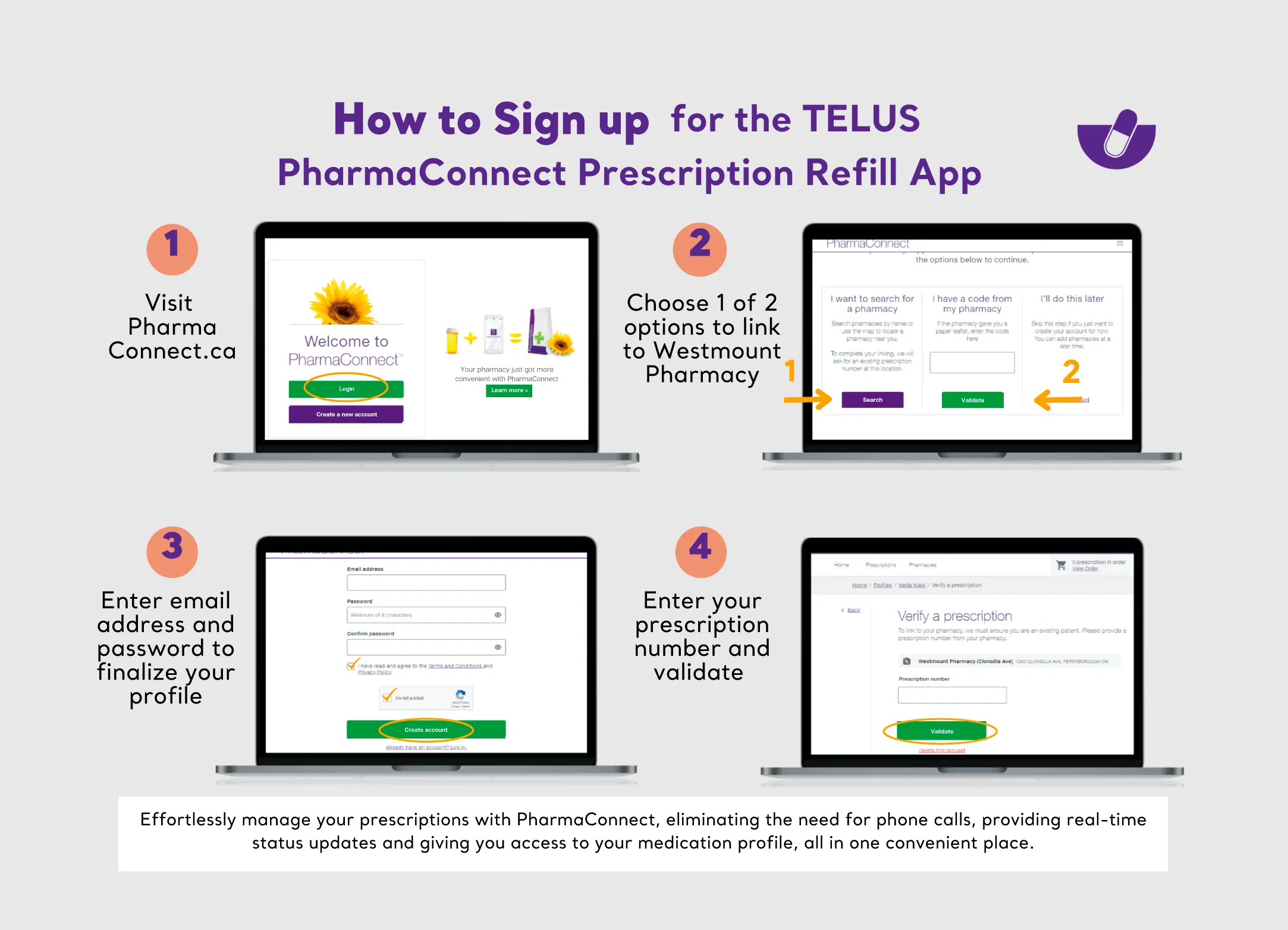 Introducing PharmaConnect, the innovative yet easy to use solution that revolutionizes the way you manage your prescriptions. Say goodbye to phone calls and hello to effortless prescription management. With PharmaConnect, you gain access to real-time status updates of your medications, a comprehensive medication profile, and seamless connectivity with your Westmount Pharmacy team.